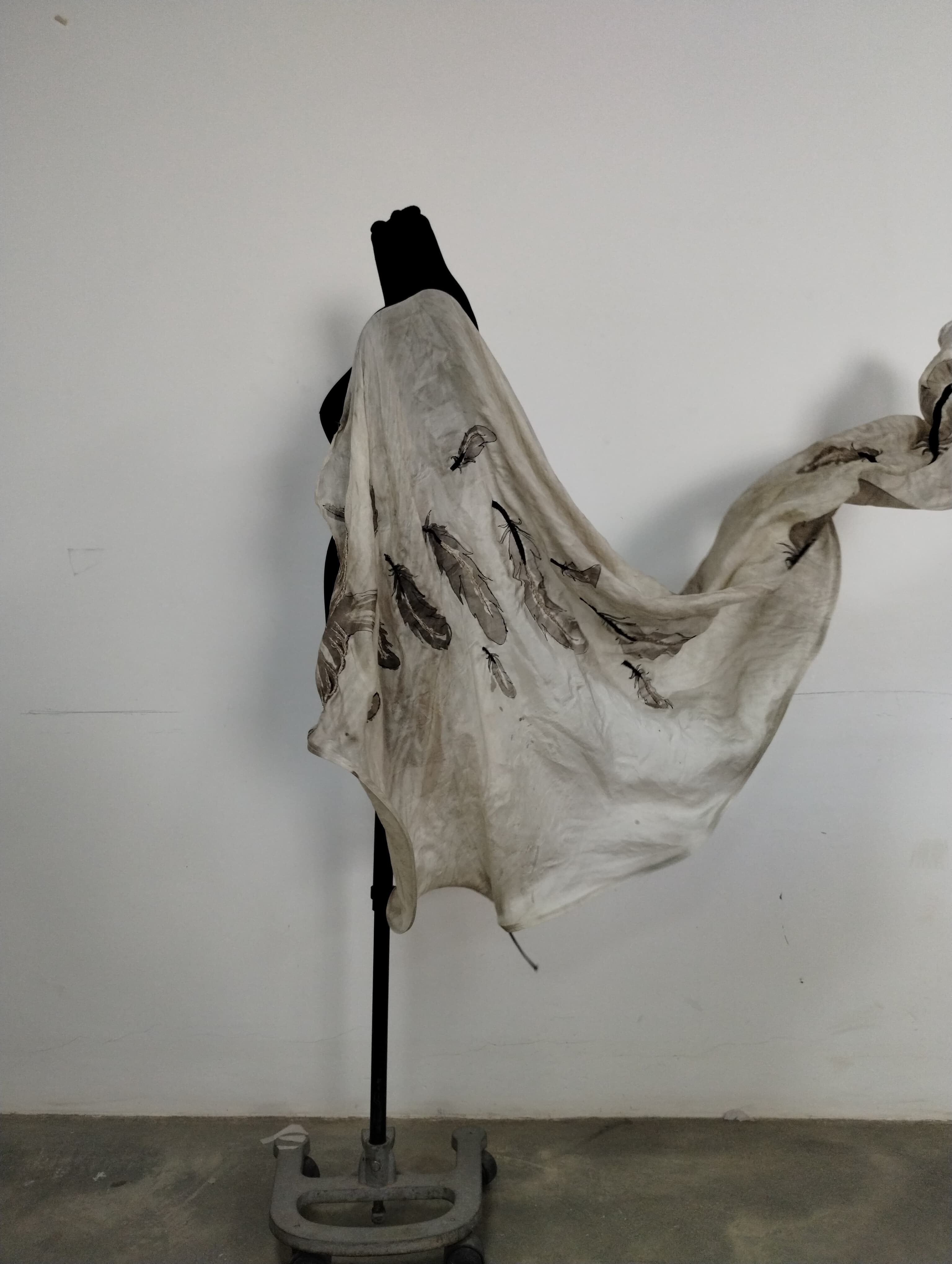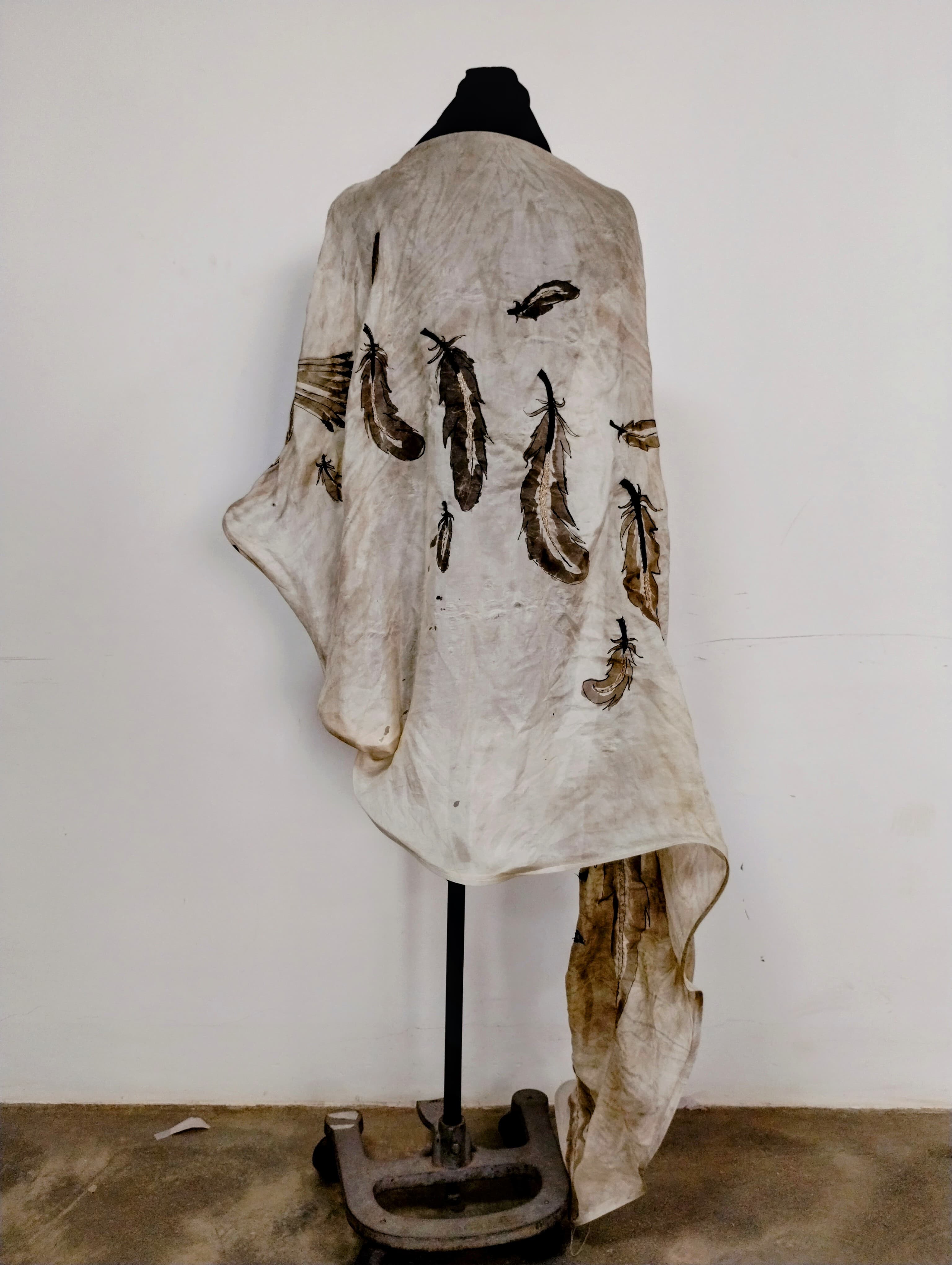 Made out of organza silk, the fabric was dyed using Arashi shibori technique, and painted using handmade paint, and then embroidered using silk threads. The motifs utilized are birds and feathers, which signify freedom in varying senses. The resulting garment also represents freedom, in the way it offers the choice in the way of being draped to the user.