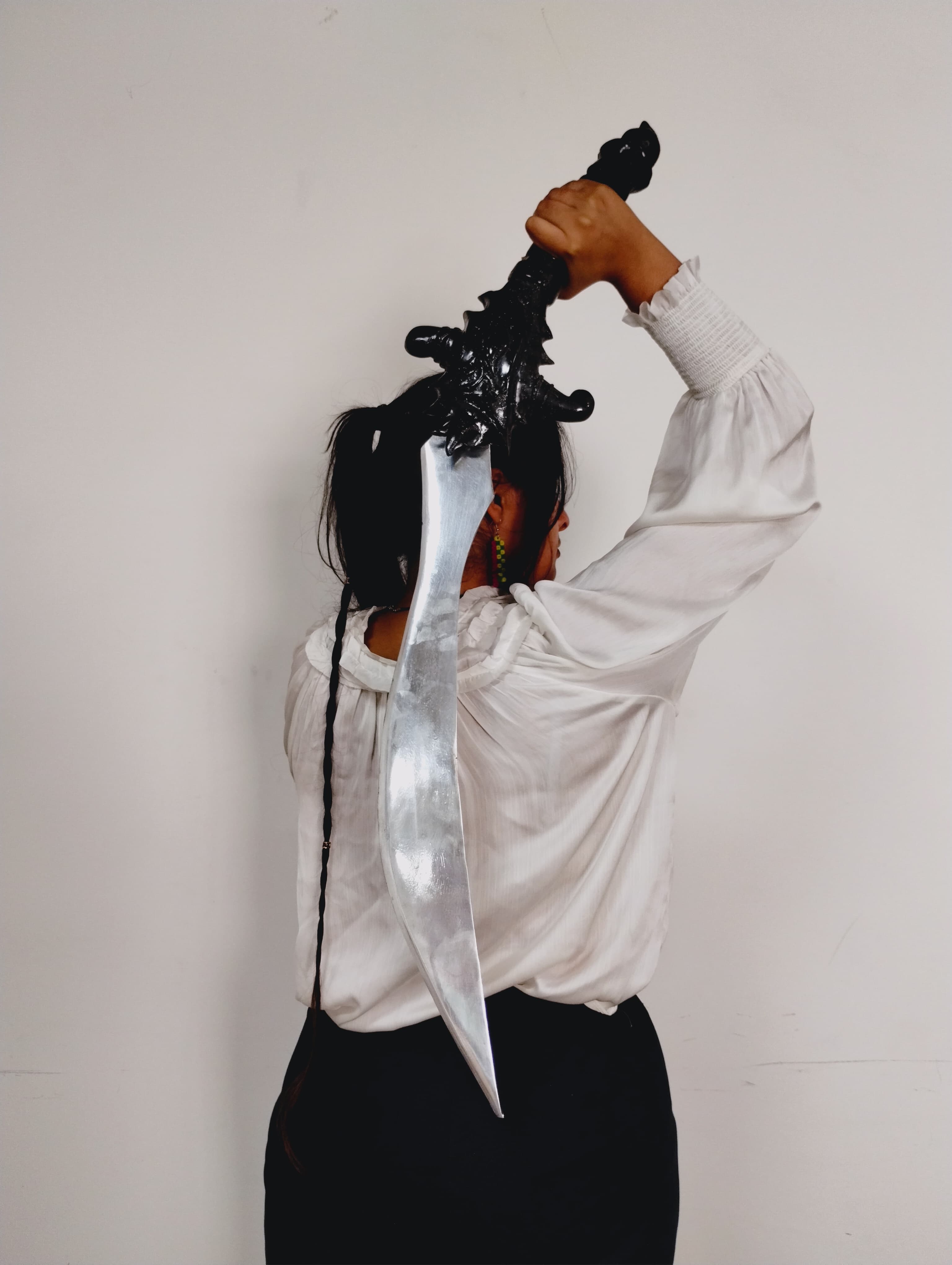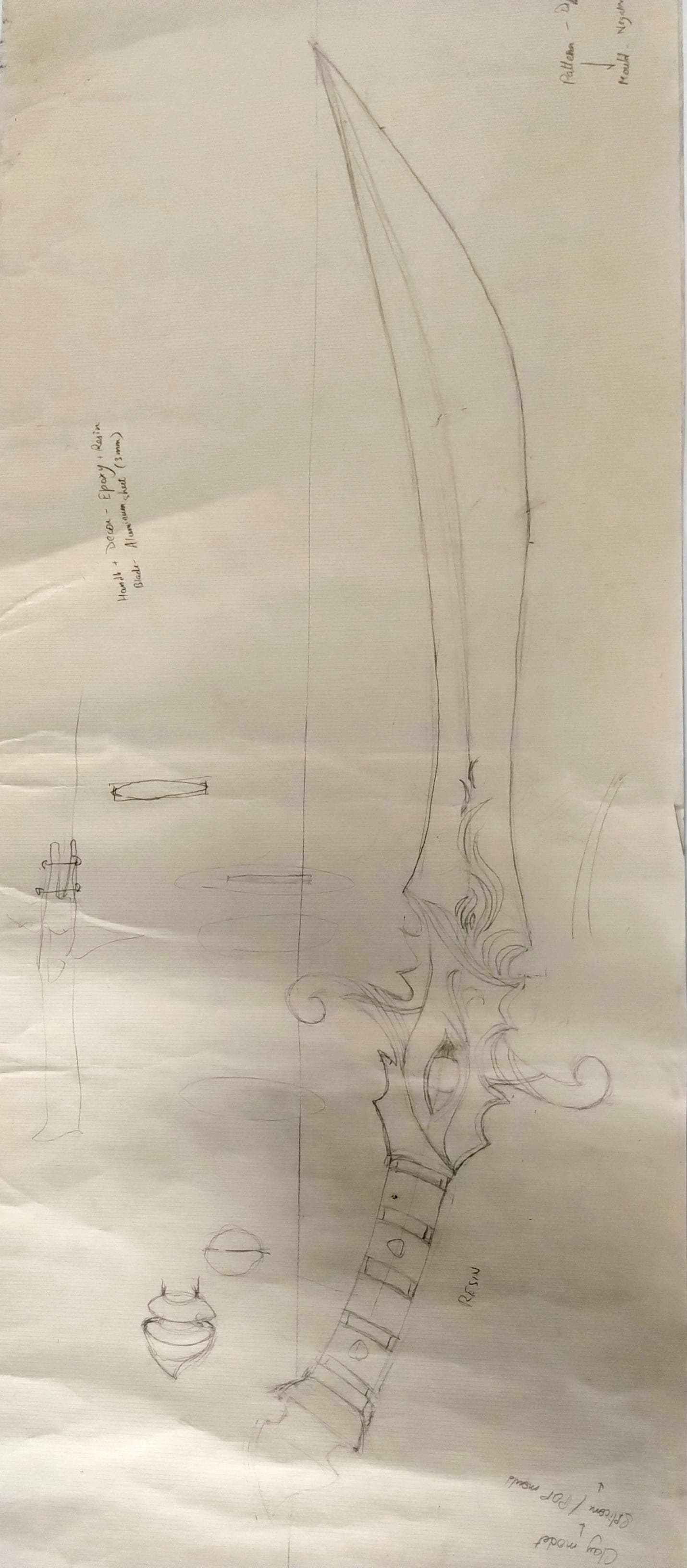 Lethal Flash is a sword created from a conceptual sword described in a story I have read previously, with aesthetics added to it to suit the character it belongs to. It was a material exploration project, where the aim was to create a product using 2-3 materials that you have never used before. The sword was made in a 4-stage process: first, a positive cast for the hilt was made from m-seal, second, a silicone mold was made from the same. Third, a resin cast was obtained from the mold. And fourth, an aluminium blade, cut, shaped, and buffed from sheet metal, was attached to the hilt using clear resin.