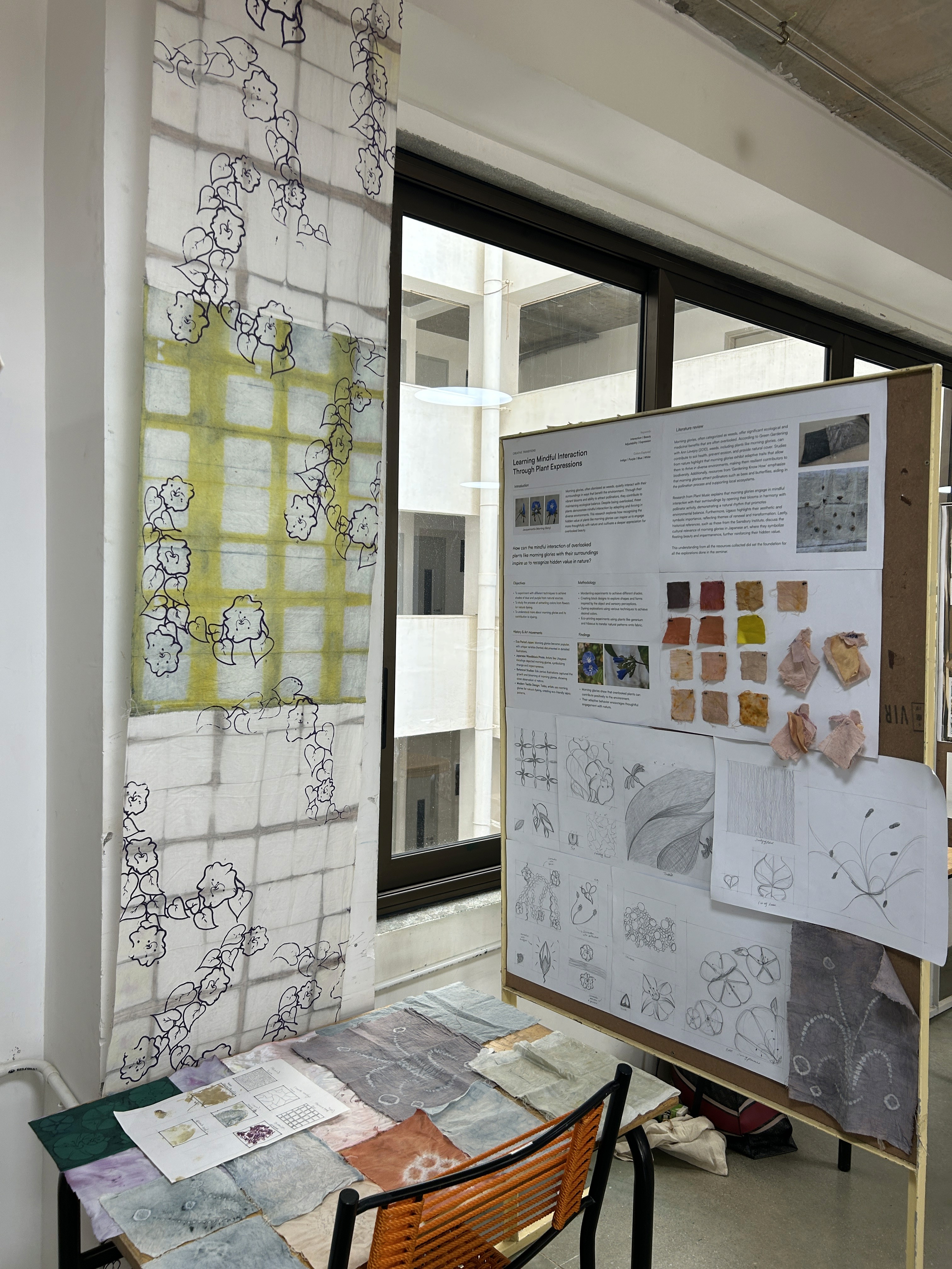 This project explored the relationship between natural elements and mindful making through the lens of overlooked plants, specifically, morning glories. Drawn to their transient beauty, I studied their form, behavior, and presence in the environment. Through block studies, material experiments, and natural dyeing, I began to understand how nature resists predictability, each fabric absorbed and responded to dye uniquely. This hands-on process revealed how colour, texture, and transformation could mirror the quiet intelligence of natural systems. Photography and sound recordings added sensory depth, helping me see the work not just as surface design, but as a conversation between maker, material, and environment. Repetition and refinement brought new surprises, reinforcing the idea that beauty often lies in the overlooked. In the end, the project became about more than textiles — it was a shift in perception, a way of learning to observe, respond to, and collaborate with nature.